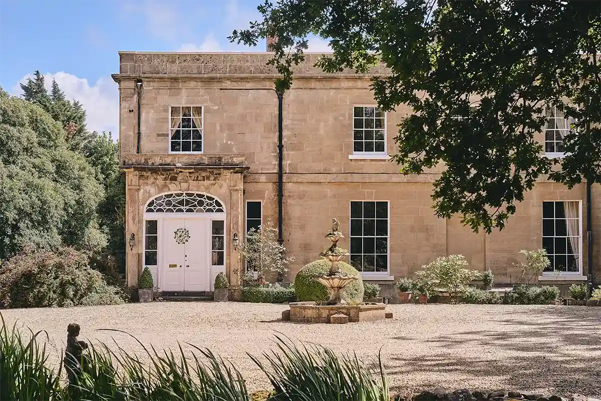 beautiful manor house front with large rectangular windows and white front door. There is an ornate fountain in the courtyard and sun is shining