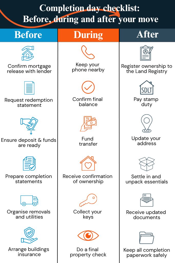 Make sure you’re fully packed and ready before completion day. Confirm removal arrangements in advance, and avoid scheduling movers too early in case completion happens later than expected. If you’re only buying, the day can be simpler, but if you’re selling and buying on the same day, it’s important to be as organised as possible.