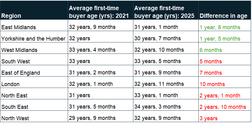 Buyer age across both the East and West Midlands seems to have dropped over the last four years. In the East, first-time buyer age has dropped by a year and eight months since 2021, and in the West, age has dropped by six months in the the same period.
