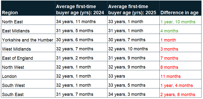 If you’re looking to get on the property ladder, where you live really may make a difference. In the South East and South West, the average age of first-time buyers has jumped by more than one and a half years since 2024, meaning people are having to wait even longer to buy their first home. Meanwhile, in the North East, the opposite is happening: the average age has actually dropped by almost two years, indicating that getting a foothold on the ladder is still a bit easier there.