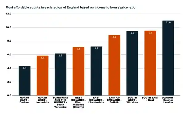 In the East of England, Suffolk and Essex are the most affordable homebuying counties, both with a score of 8.9. Norfolk (9.0) and Cambridgeshire (9.2) place second and third.