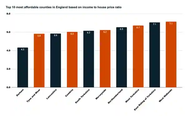 As mentioned, Durham is the most affordable county in England and, therefore, the North East with an affordability score of 4.3, but in a close second is Tyne & Wear with a score of 5.8, followed by Northumberland (6.5).