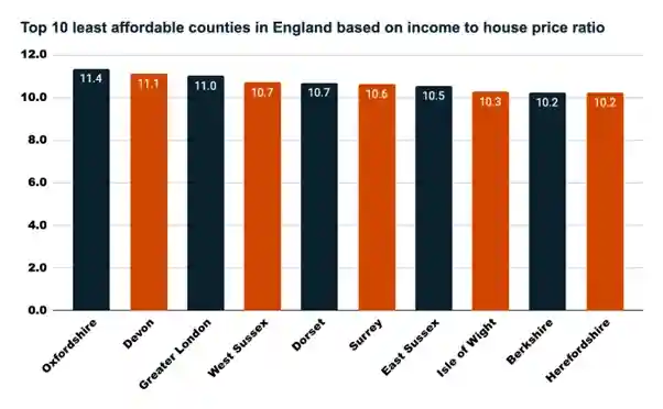 In the South East, the most affordable county is Kent. The average cost of a home is £342,268 and the average income is £35,992 producing an affordability score of 9.5.